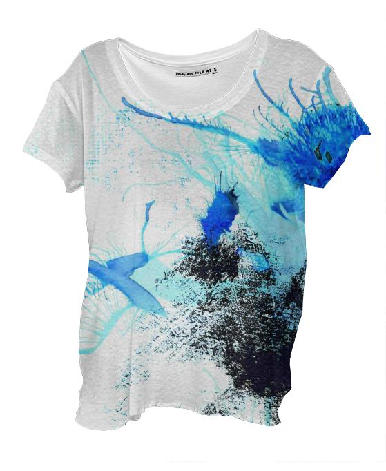 Loose fitting scoop neck shirt with nice drape and curved bottom hem.
