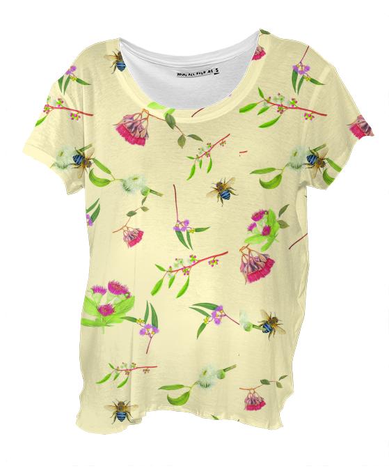 Loose fitting scoop neck shirt with nice drape and curved bottom hem.