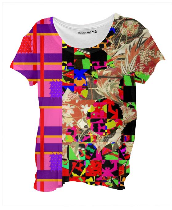 Loose fitting scoop neck shirt with nice drape and curved bottom hem.