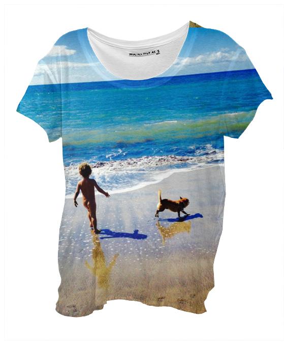 Loose fitting scoop neck shirt with nice drape and curved bottom hem.