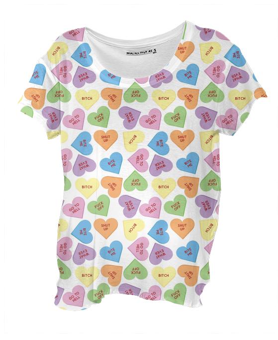 Loose fitting scoop neck shirt with nice drape and curved bottom hem.