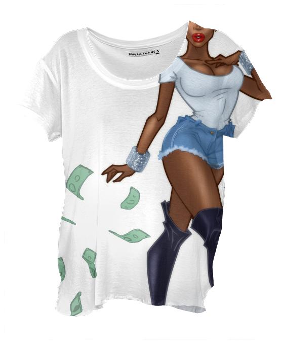 Loose fitting scoop neck shirt with nice drape and curved bottom hem.