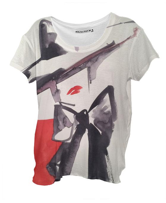 Loose fitting scoop neck shirt with nice drape and curved bottom hem.