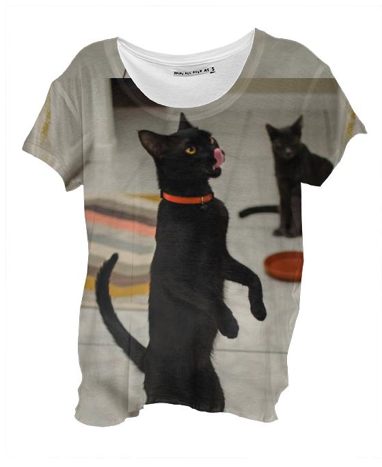 Loose fitting scoop neck shirt with nice drape and curved bottom hem.