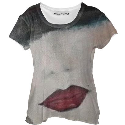 Loose fitting scoop neck shirt with nice drape and curved bottom hem.