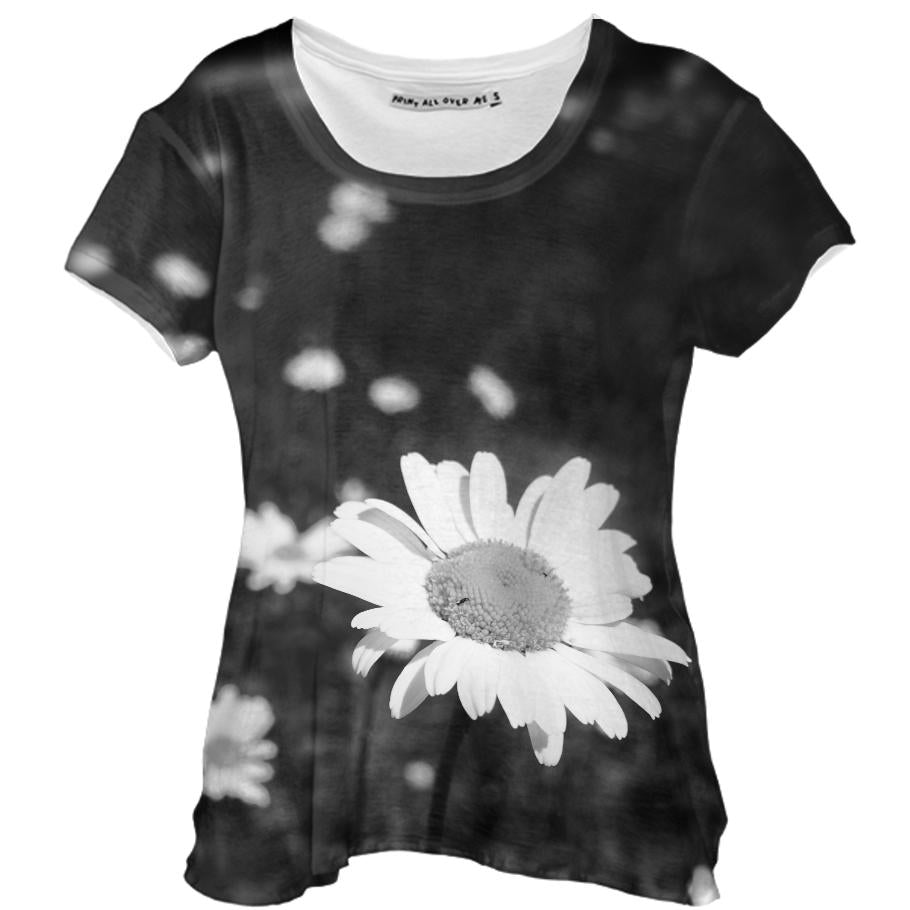 Loose fitting scoop neck shirt with nice drape and curved bottom hem.