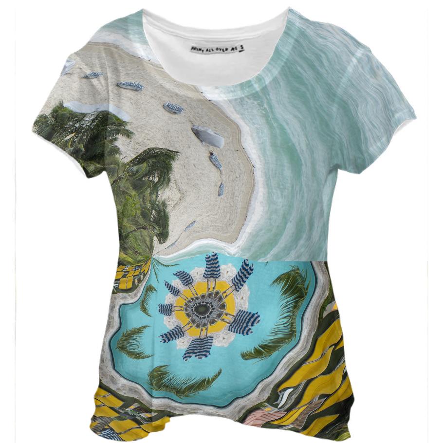 Loose fitting scoop neck shirt with nice drape and curved bottom hem.