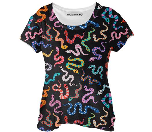Loose fitting scoop neck shirt with nice drape and curved bottom hem.