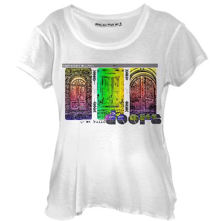 Loose fitting scoop neck shirt with nice drape and curved bottom hem.