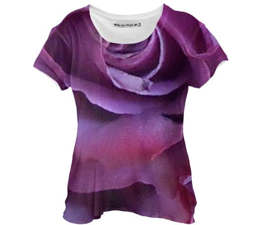Loose fitting scoop neck shirt with nice drape and curved bottom hem.