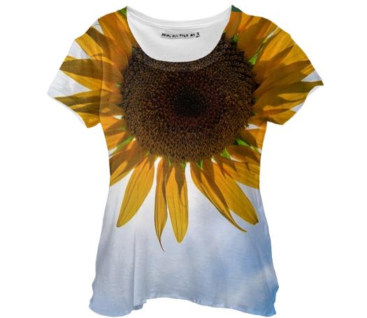 Loose fitting scoop neck shirt with nice drape and curved bottom hem.