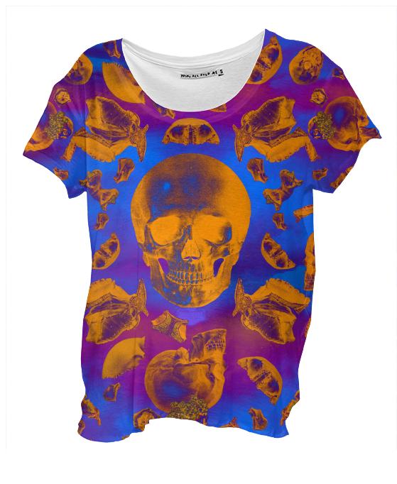 Loose fitting scoop neck shirt with nice drape and curved bottom hem.