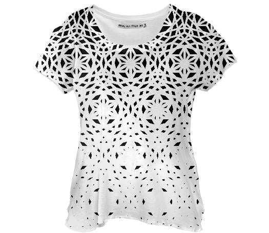 Loose fitting scoop neck shirt with nice drape and curved bottom hem.