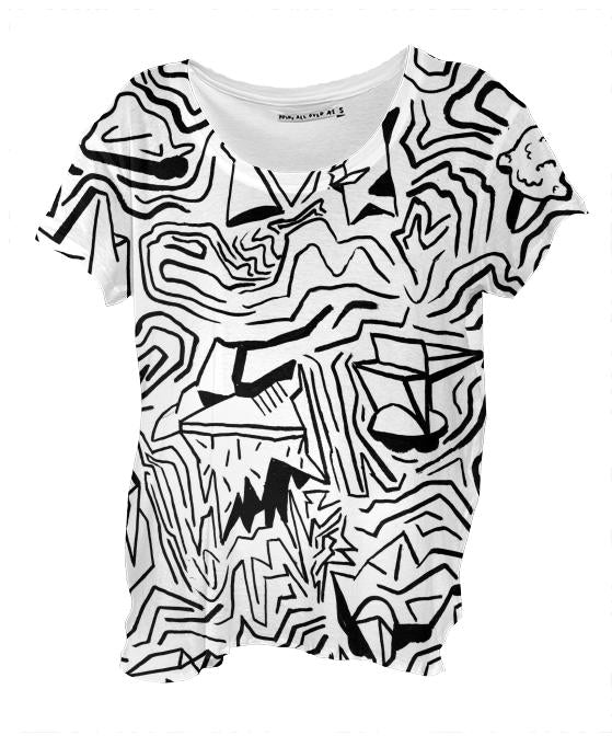 Loose fitting scoop neck shirt with nice drape and curved bottom hem.