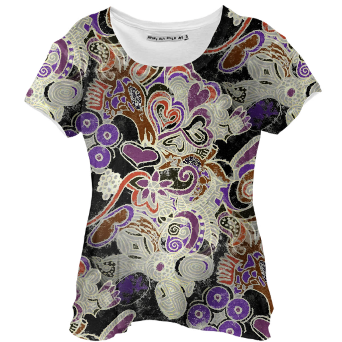 Loose fitting scoop neck shirt with nice drape and curved bottom hem.