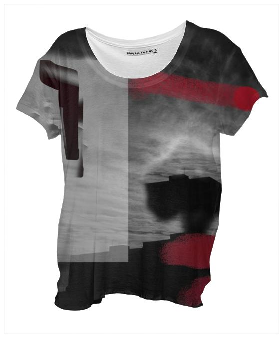 Loose fitting scoop neck shirt with nice drape and curved bottom hem.