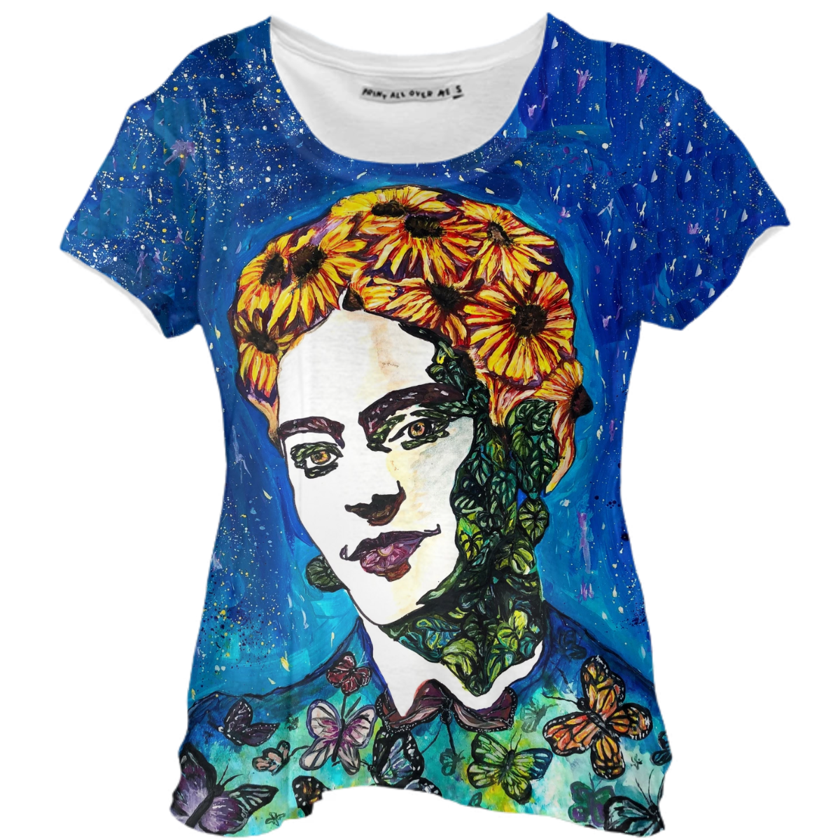 Loose fitting scoop neck shirt with nice drape and curved bottom hem.