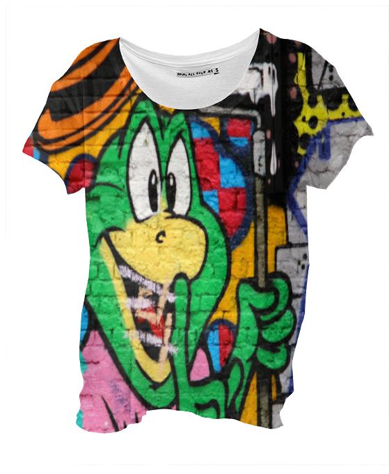 Loose fitting scoop neck shirt with nice drape and curved bottom hem.