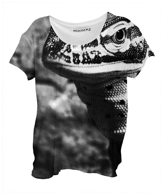 Loose fitting scoop neck shirt with nice drape and curved bottom hem.