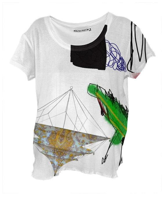 Loose fitting scoop neck shirt with nice drape and curved bottom hem.