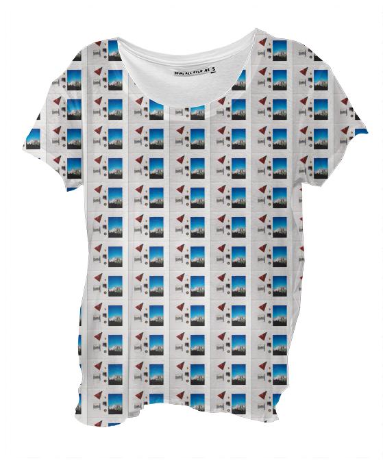 Loose fitting scoop neck shirt with nice drape and curved bottom hem.