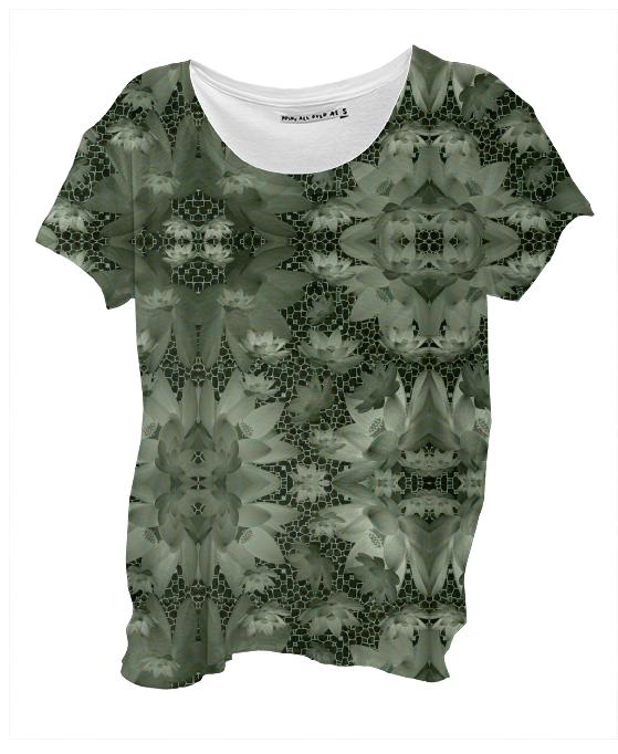 Loose fitting scoop neck shirt with nice drape and curved bottom hem.