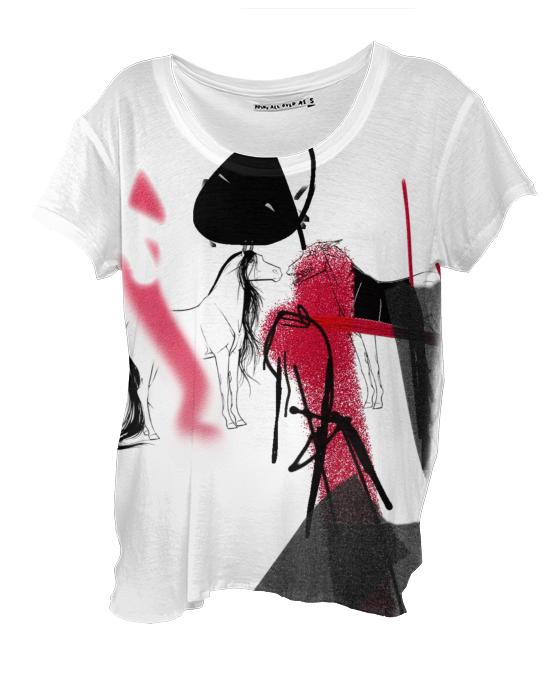 Loose fitting scoop neck shirt with nice drape and curved bottom hem.