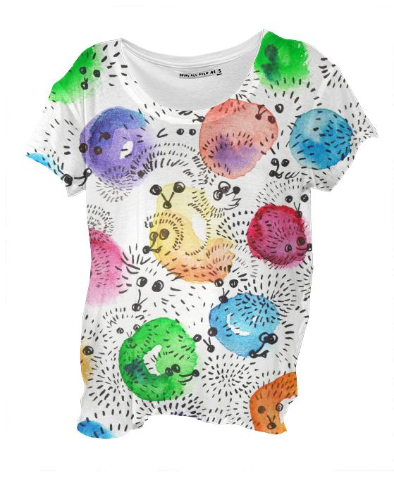 Loose fitting scoop neck shirt with nice drape and curved bottom hem.