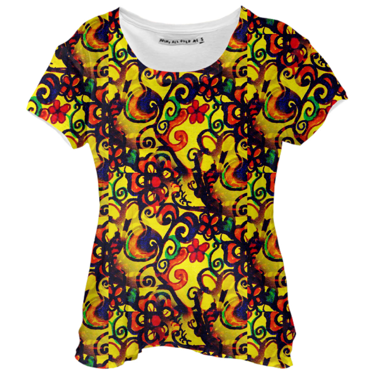 Loose fitting scoop neck shirt with nice drape and curved bottom hem.