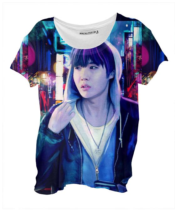 Loose fitting scoop neck shirt with nice drape and curved bottom hem.