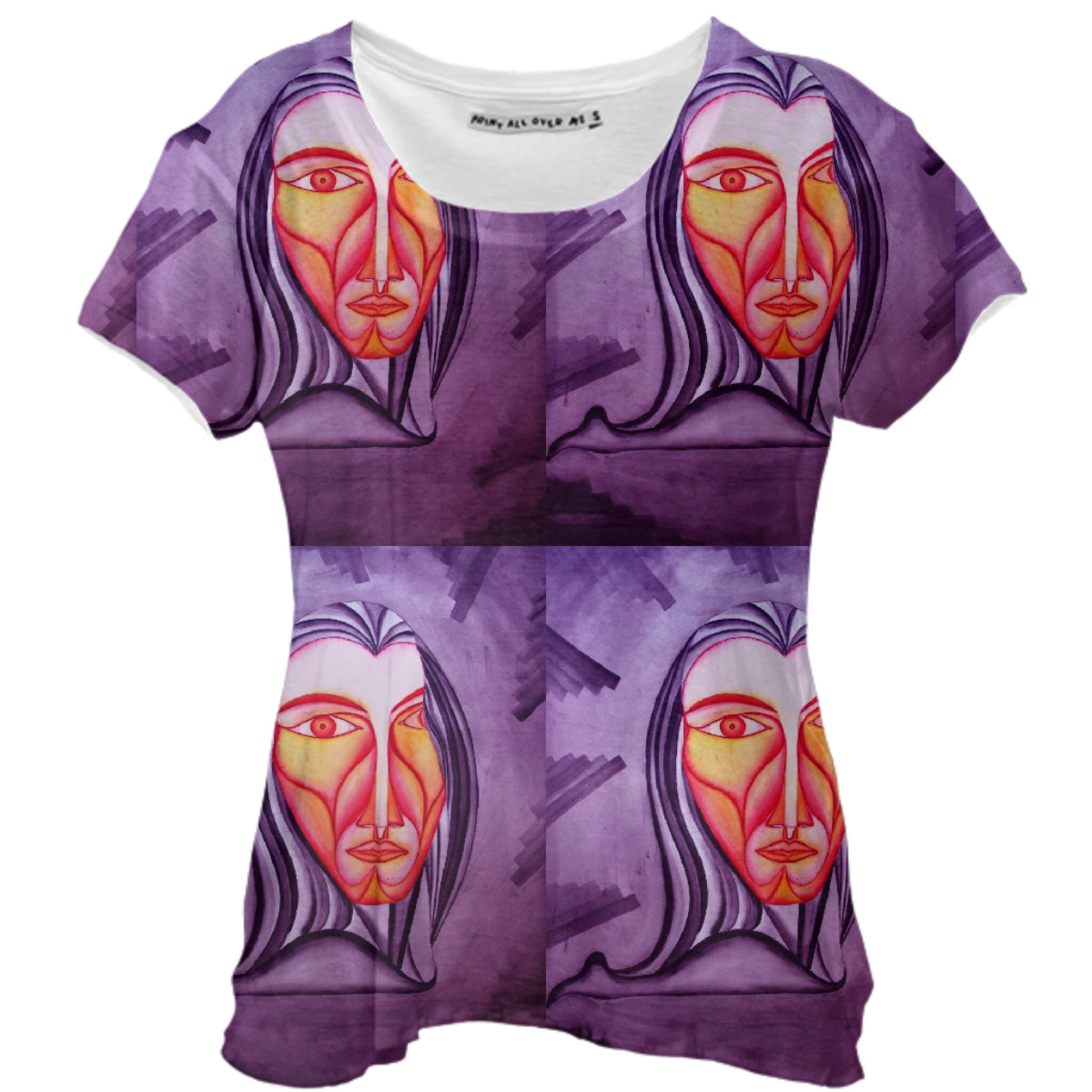 Loose fitting scoop neck shirt with nice drape and curved bottom hem.