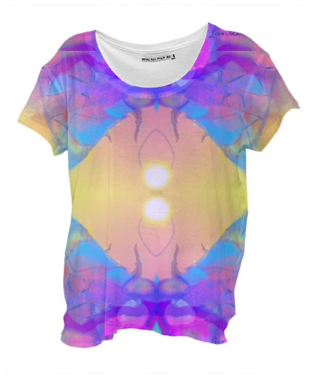 Loose fitting scoop neck shirt with nice drape and curved bottom hem.
