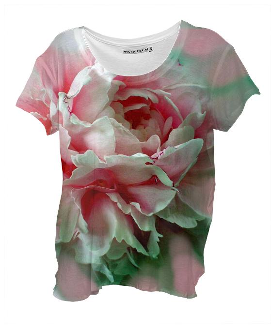 Loose fitting scoop neck shirt with nice drape and curved bottom hem.