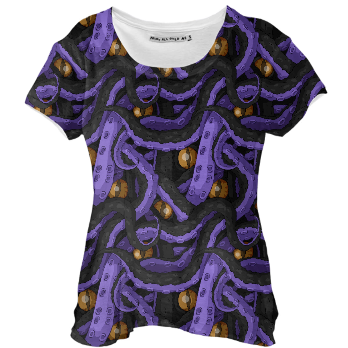 Loose fitting scoop neck shirt with nice drape and curved bottom hem.