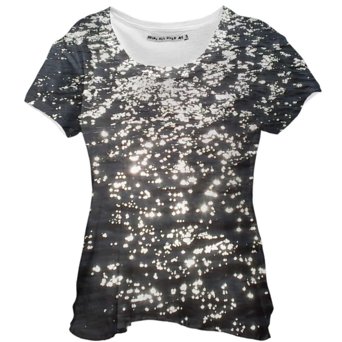 Loose fitting scoop neck shirt with nice drape and curved bottom hem.
