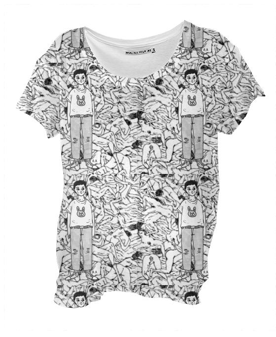 Loose fitting scoop neck shirt with nice drape and curved bottom hem.