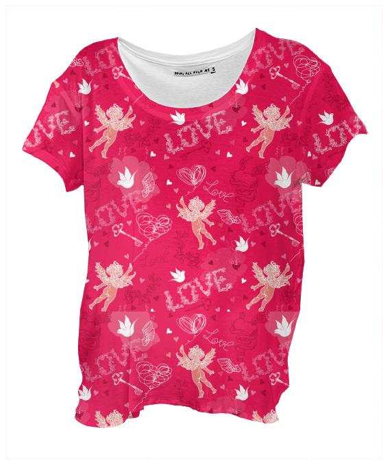 Loose fitting scoop neck shirt with nice drape and curved bottom hem.