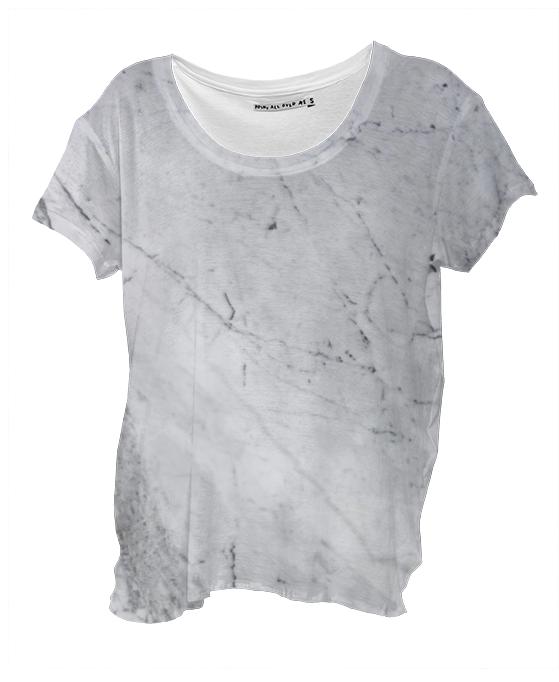 Loose fitting scoop neck shirt with nice drape and curved bottom hem.