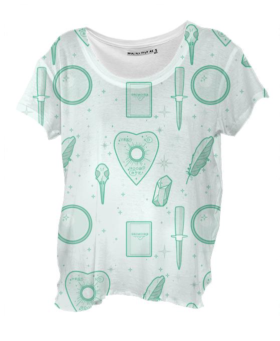 Loose fitting scoop neck shirt with nice drape and curved bottom hem.