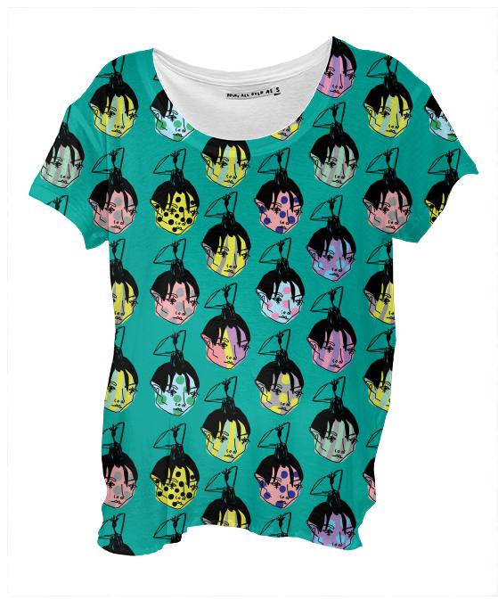 Loose fitting scoop neck shirt with nice drape and curved bottom hem.