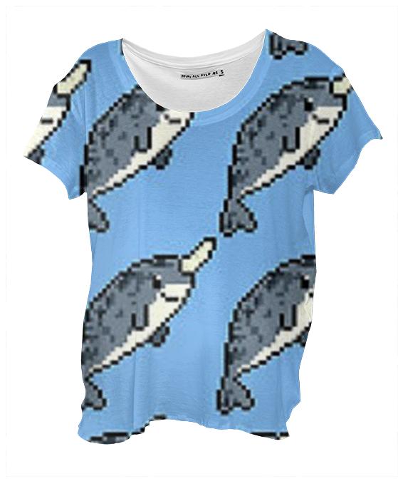 Loose fitting scoop neck shirt with nice drape and curved bottom hem.