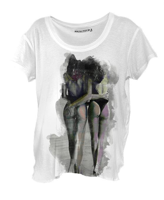 Loose fitting scoop neck shirt with nice drape and curved bottom hem.