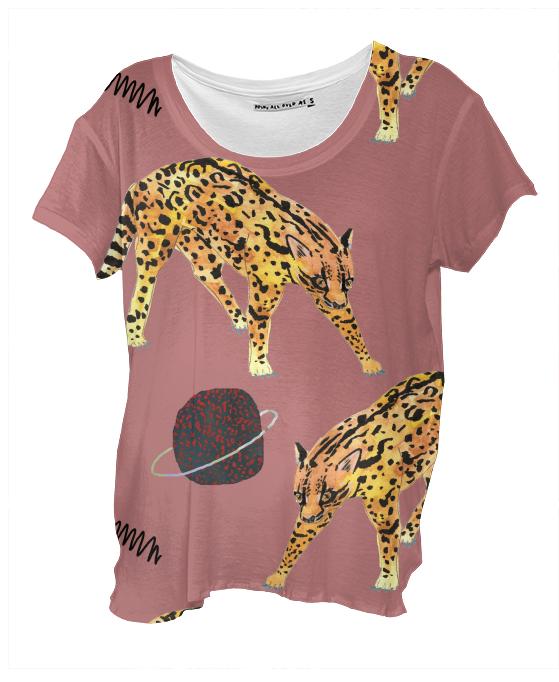 Loose fitting scoop neck shirt with nice drape and curved bottom hem.