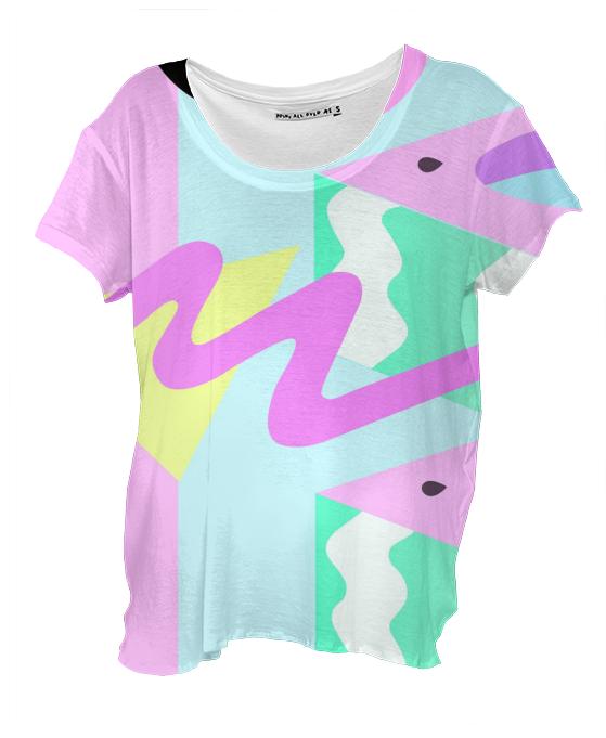 Loose fitting scoop neck shirt with nice drape and curved bottom hem.