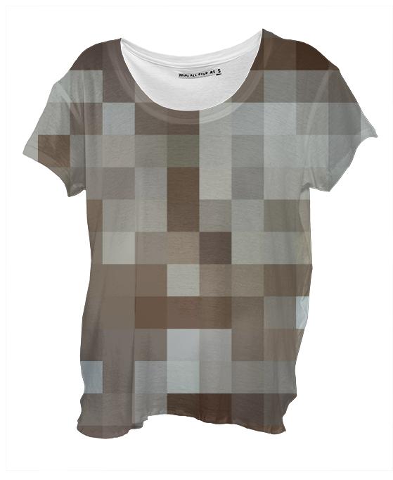 Loose fitting scoop neck shirt with nice drape and curved bottom hem.