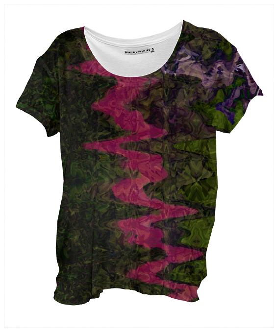 Loose fitting scoop neck shirt with nice drape and curved bottom hem.