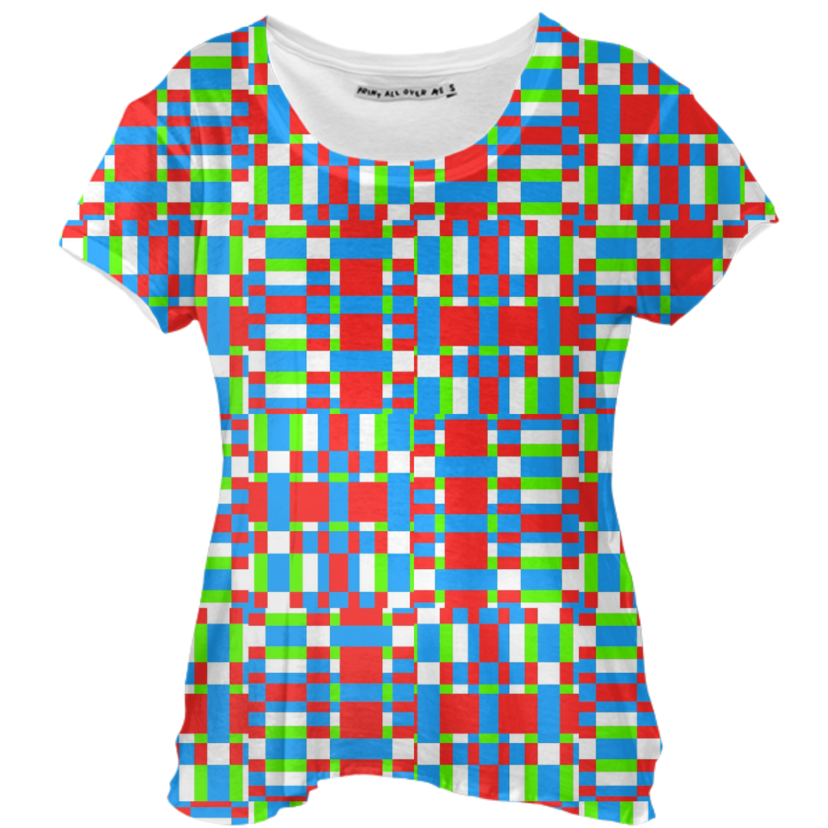 Loose fitting scoop neck shirt with nice drape and curved bottom hem.