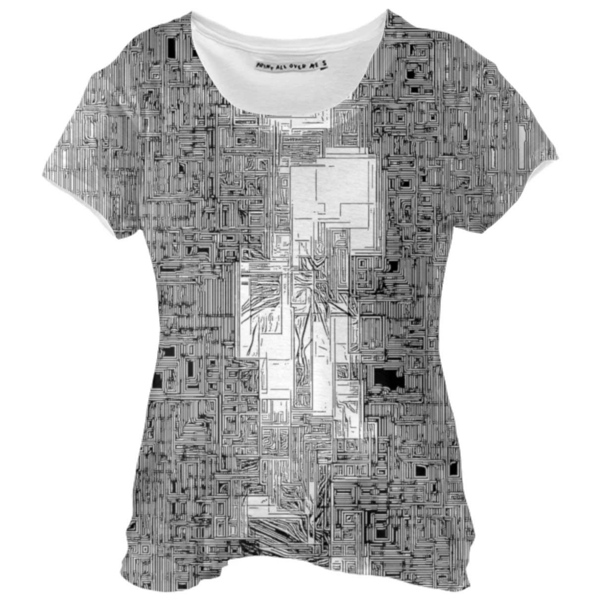 Loose fitting scoop neck shirt with nice drape and curved bottom hem.
