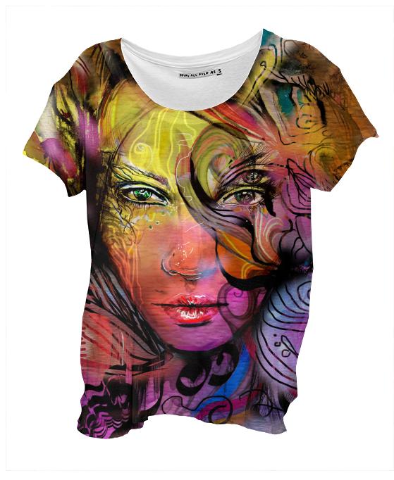Loose fitting scoop neck shirt with nice drape and curved bottom hem.