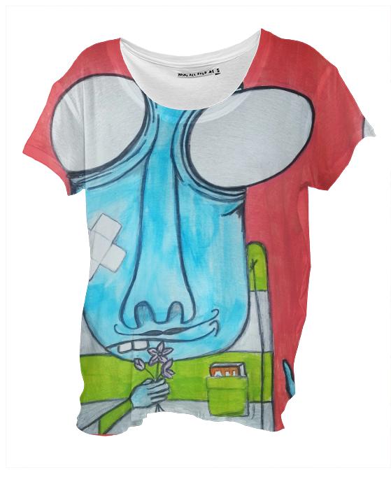 Loose fitting scoop neck shirt with nice drape and curved bottom hem.
